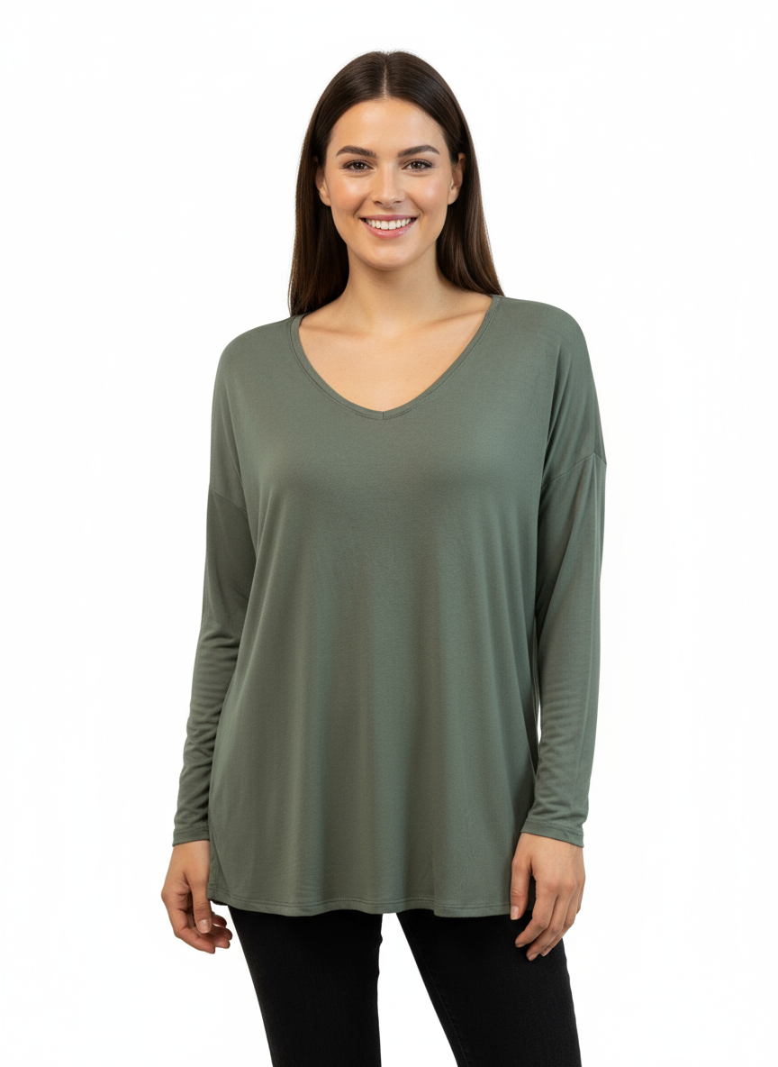 Pohodlné dámské tričko s dlouhým rukávem v trendy khaki barvě. Volný střih s véčkovým výstřihem zajišťuje maximální pohodlí a moderní vzhled.