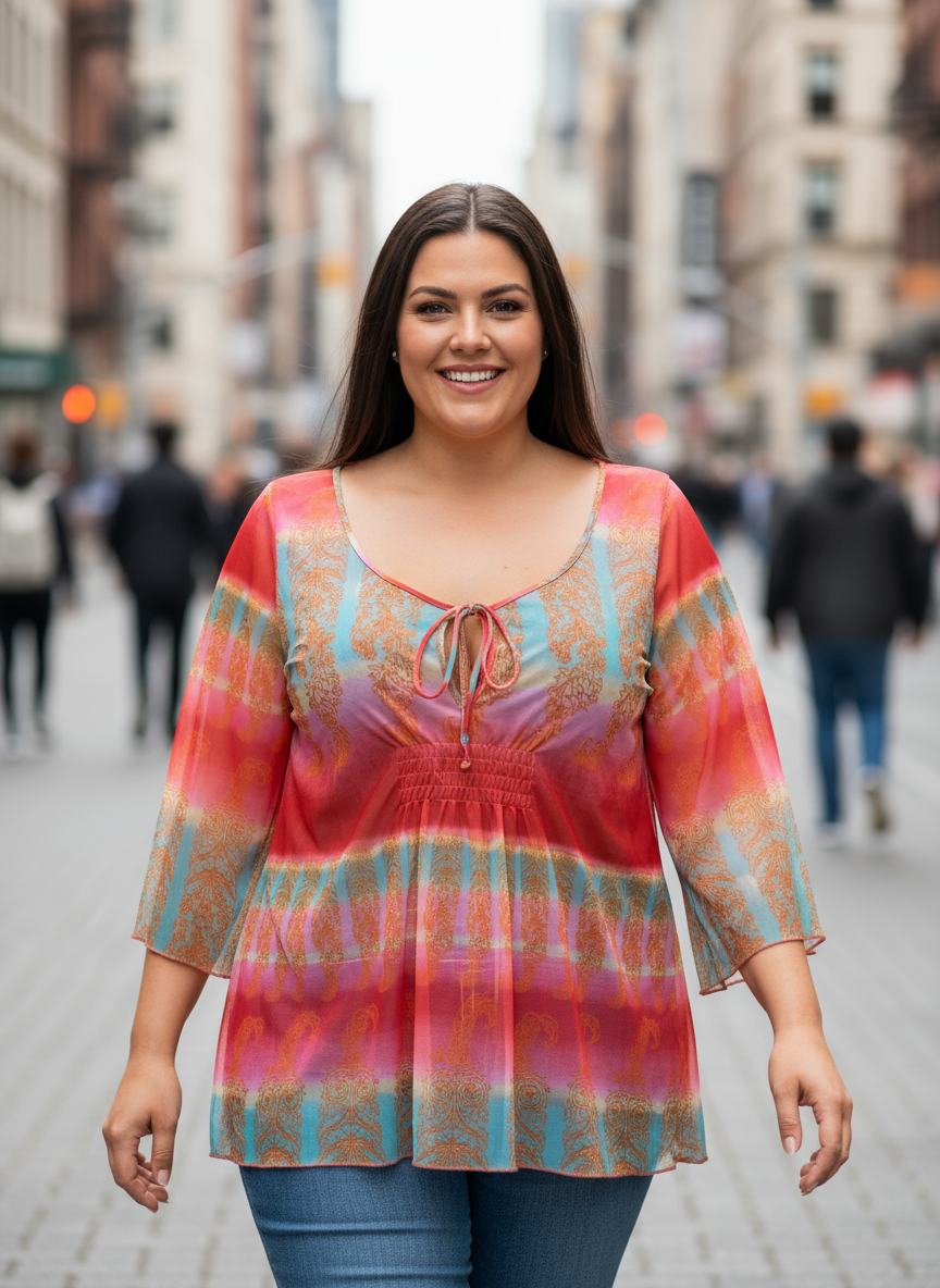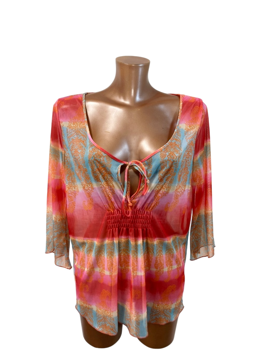 Efektní dámská halenka ve velikosti 44/46 s barevným vzorem a zlatými detaily.