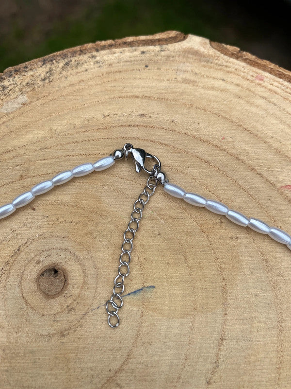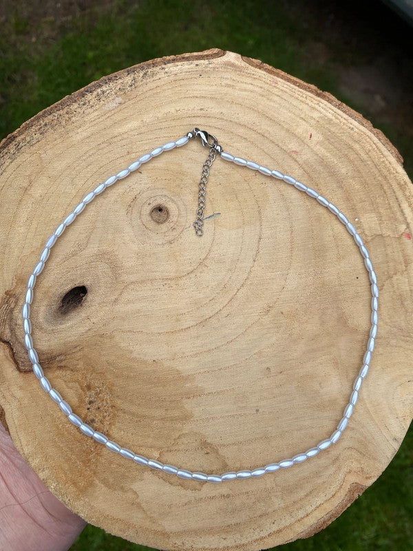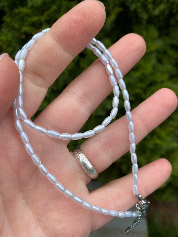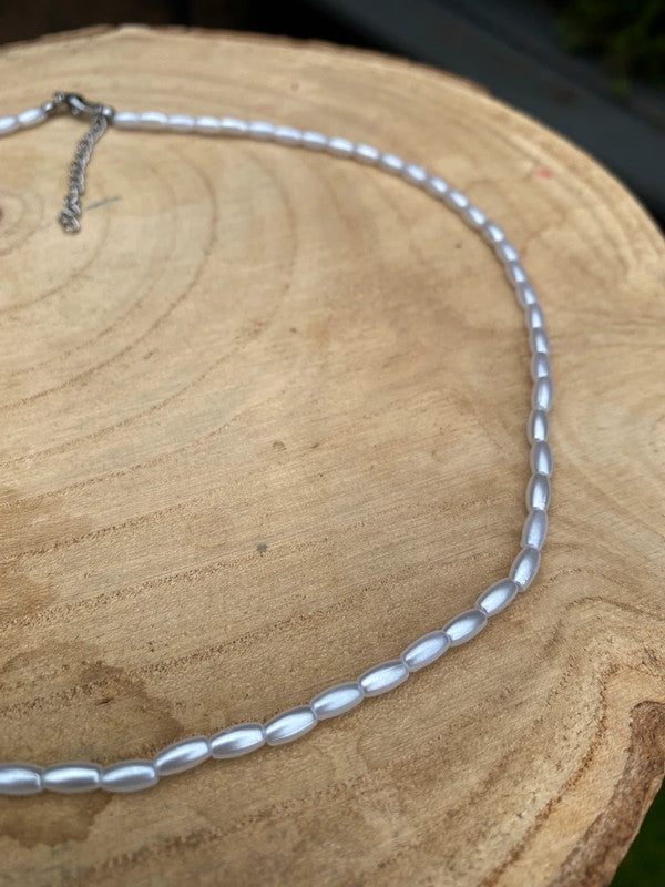 Jemný náhrdelník z rýžových perlí a komponentu z chirurgické oceli. Ruční práce. Necerna apod.