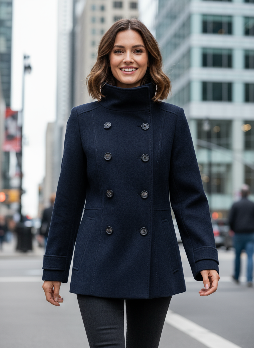 Stylový dámský kabát značky H&M ve velikosti 34 v tmavě modré barvě s dvojřadovým zapínáním.