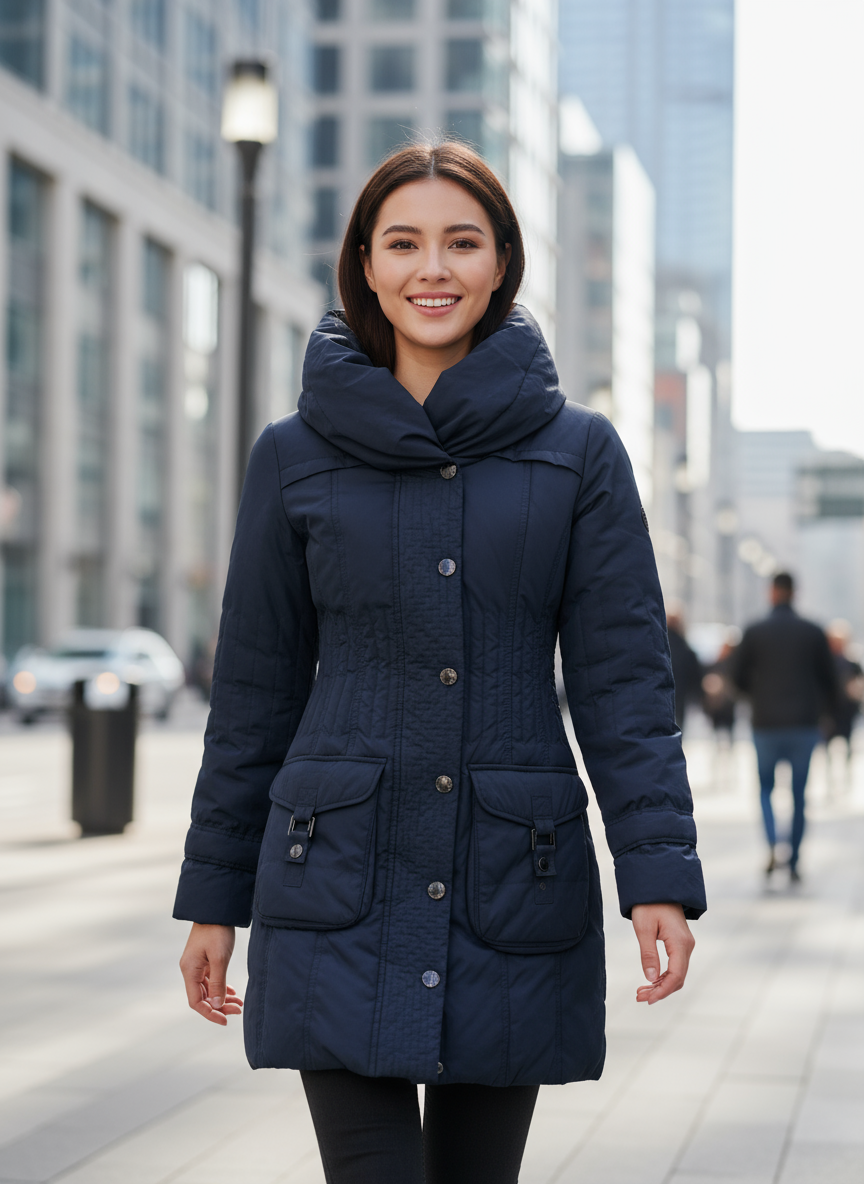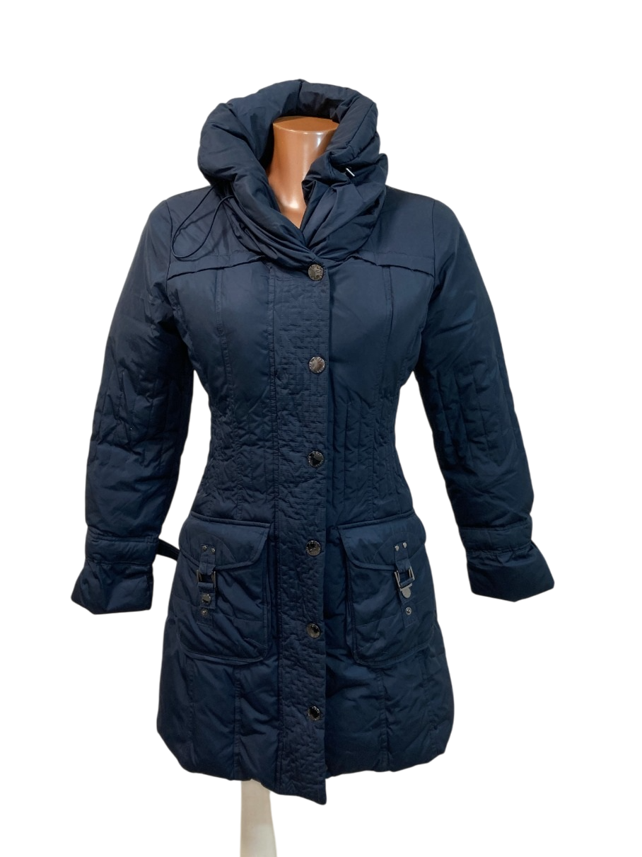 Elegantní dámský prošívaný kabát značky Mexx ve velikosti 32 v tmavě modré barvě s velkým límcem.