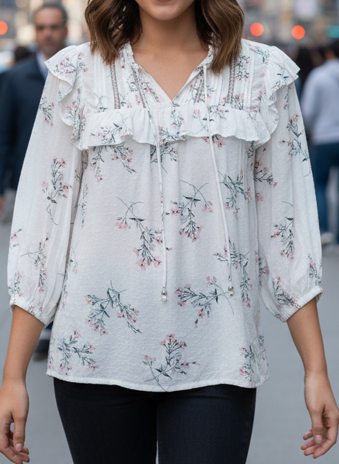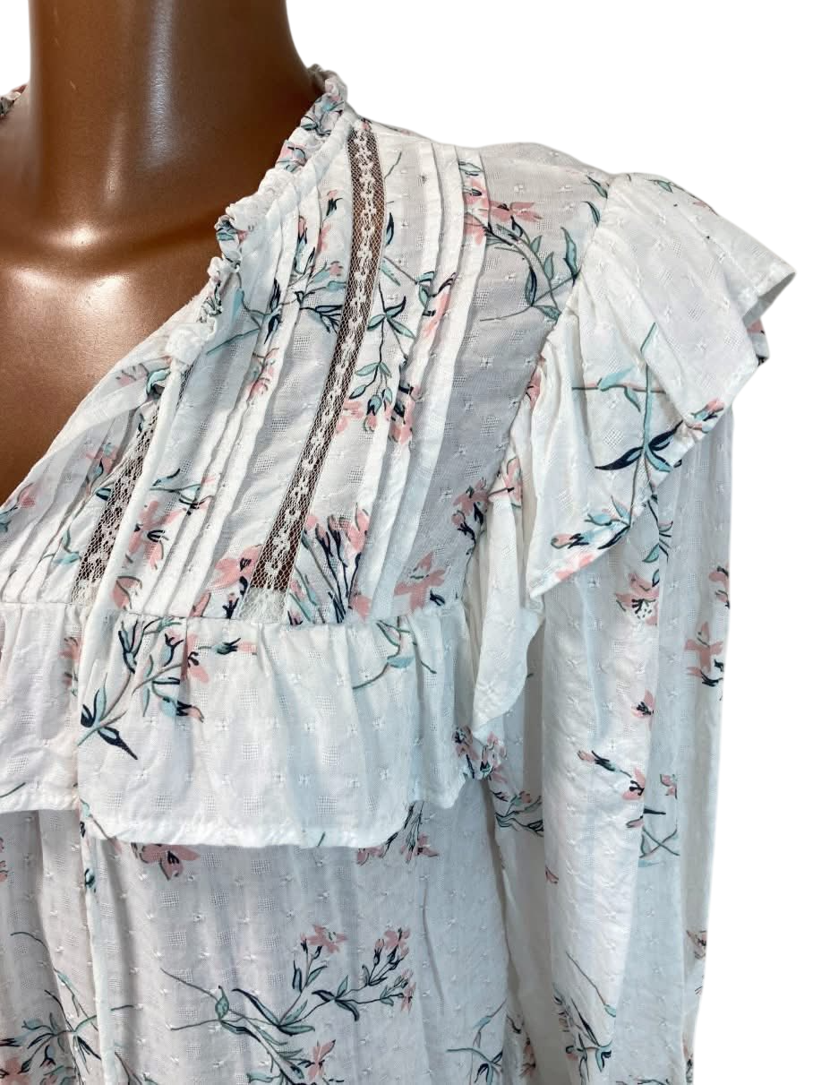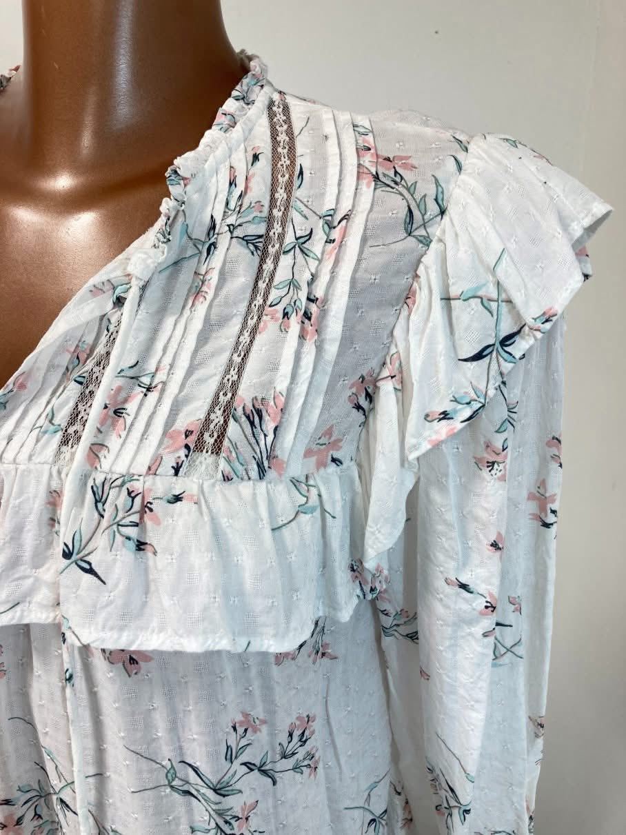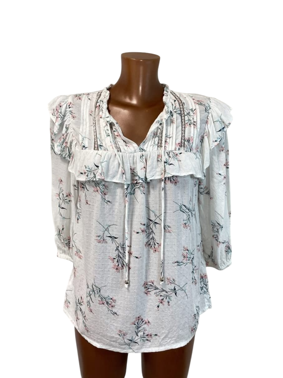Romantická dámská košile značky F&F v bílé barvě s jemným květinovým vzorem a volánovým detailem.