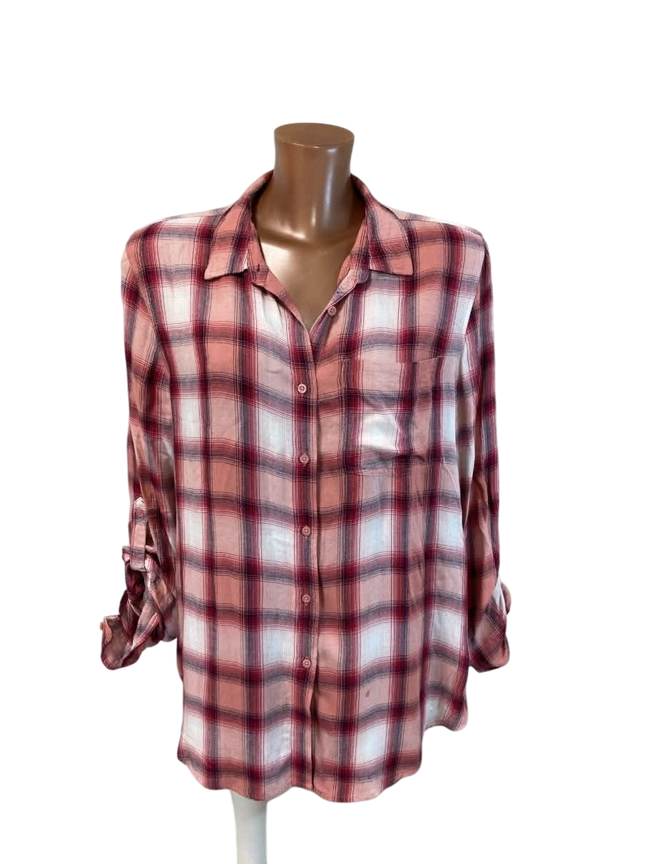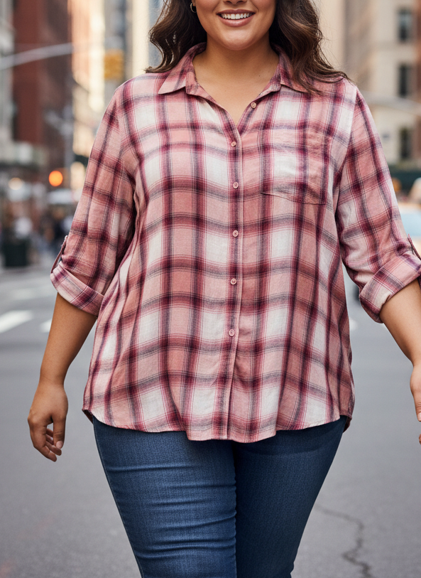Stylová dámská košile v růžovo-bílém károvaném vzoru s možností vyhrnout rukávy.