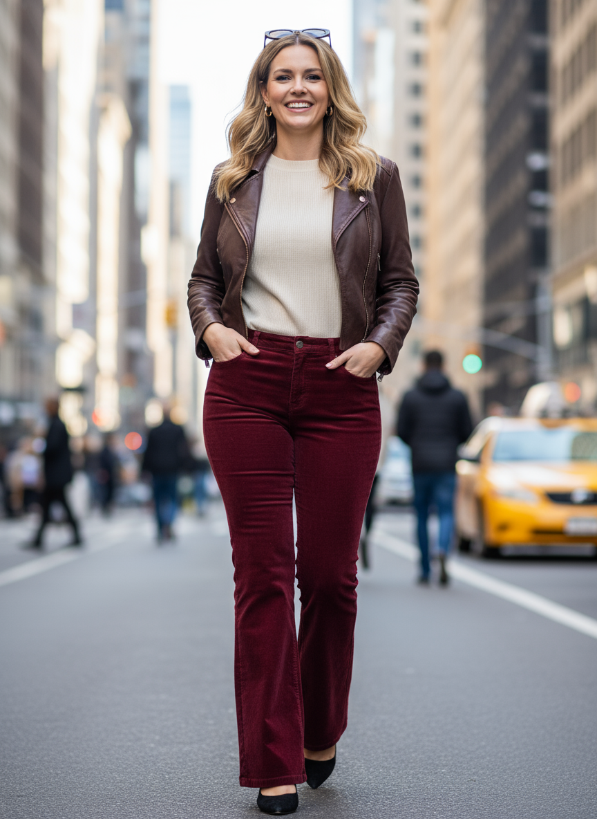 Stylové dámské manžestrákové kalhoty značky BPC ve velikosti 46 v krásné vínové barvě.
