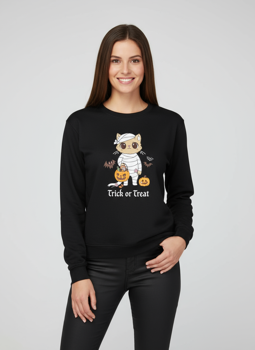 - Potisk kočičky v mumii s nápisem 'Trick or Treat'