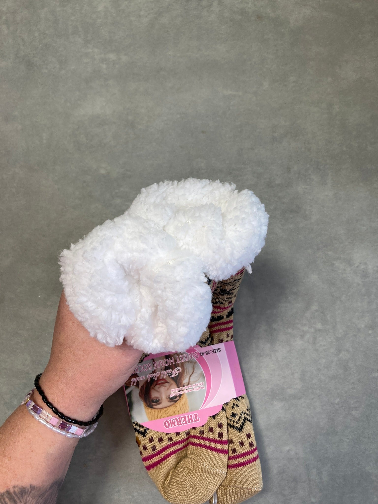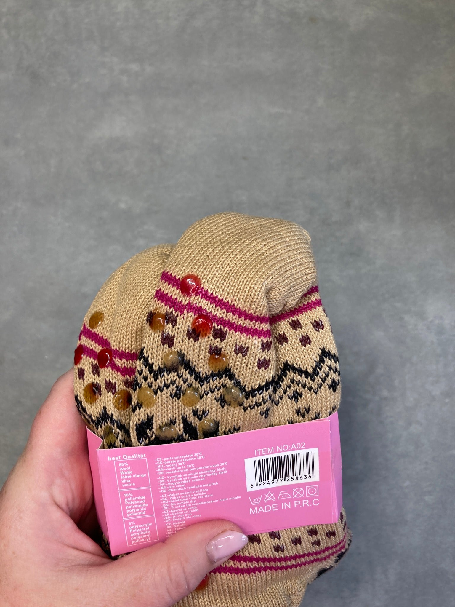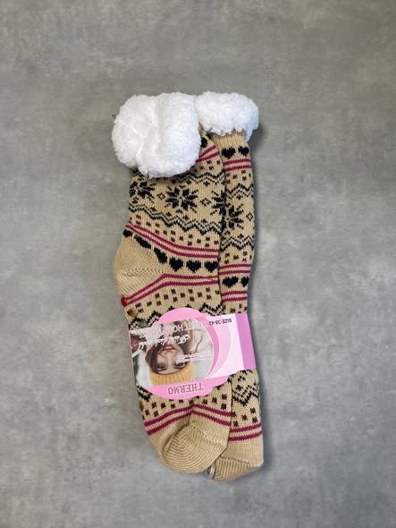 Teplé a pohodlné ponožky s kožešinovou podšívkou, ideální pro chladné dny. Klasický vzor v béžové barvě s červenými a černými detaily dodá vašim nohám nejen teplo, ale i styl.