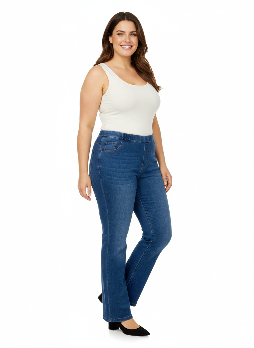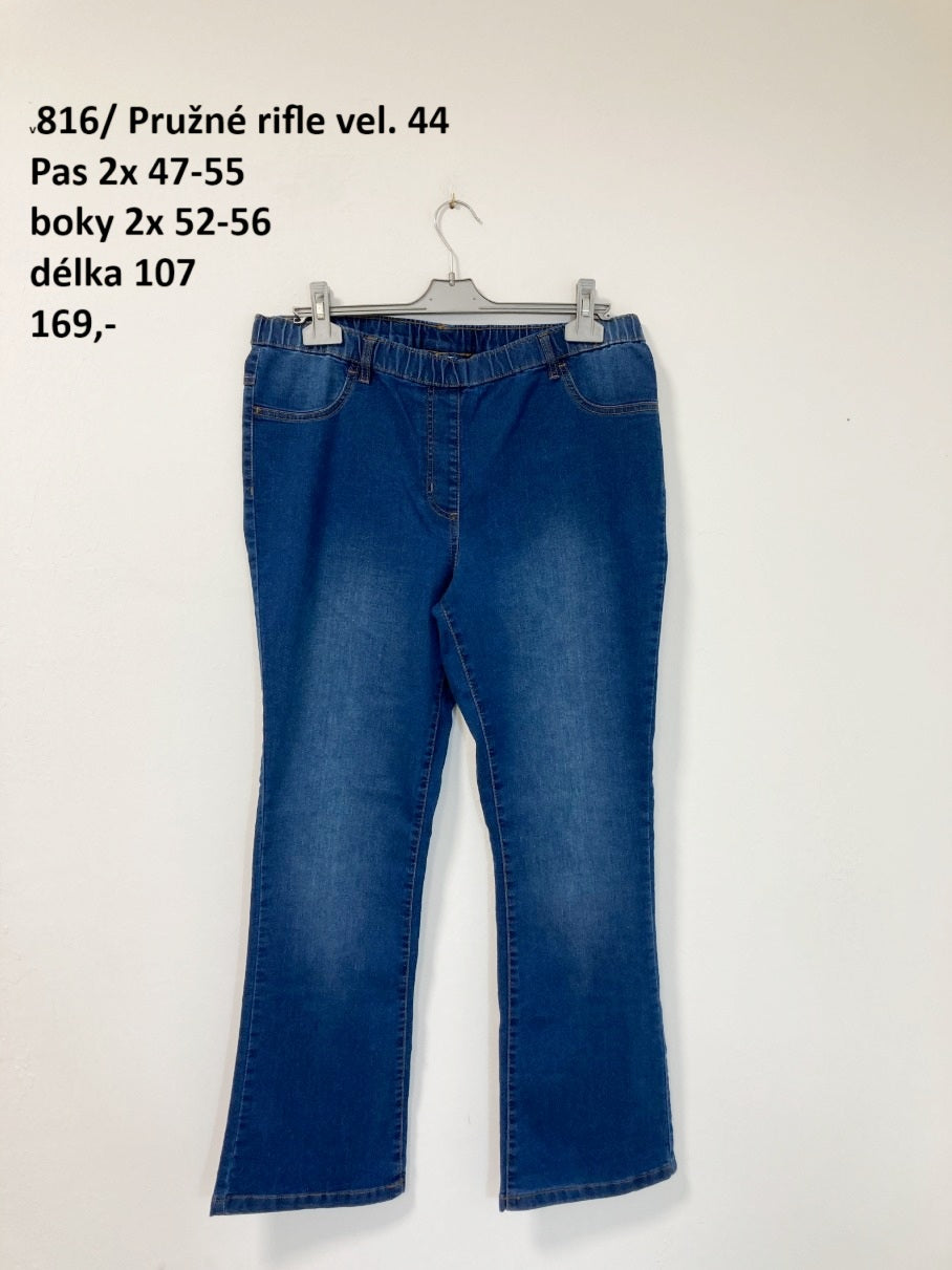 Pohodlné dámské pružné rifle ve velikosti 44 v klasické modré barvě.