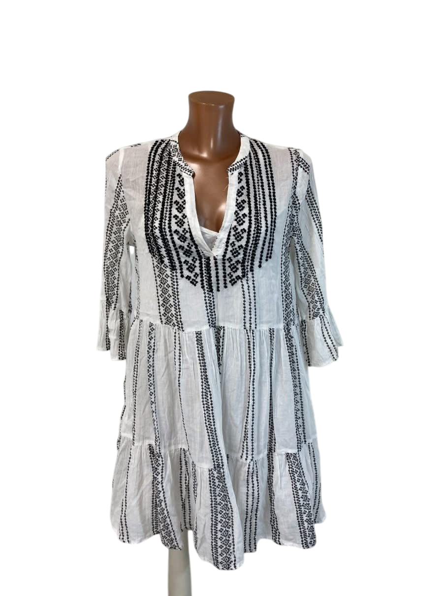 Krásné dámské šaty značky C&A v bílé barvě s černým etno vzorem a volánovým střihem.