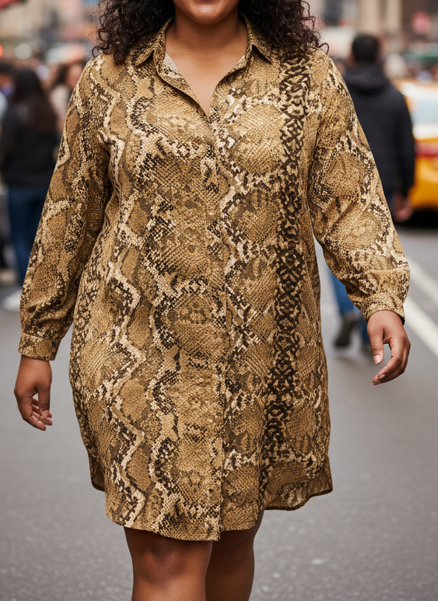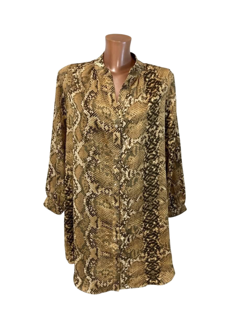 Elegantní dámské košilové šaty značky H&M s hadím vzorem v teplých zlatohnědých tónech.
