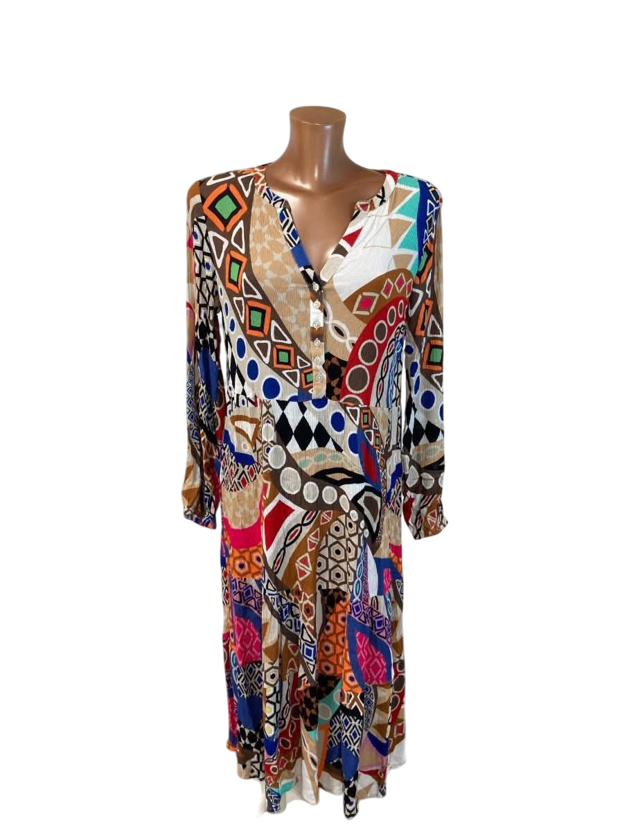 Nádherné dámské šaty značky Heine s barevným geometrickým vzorem a mačkaným efektem jako mušelín.