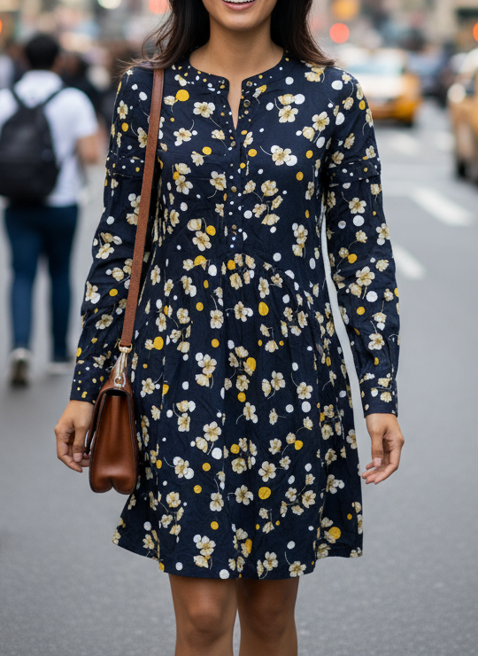 Krásné dámské šaty značky Penny Black v tmavě modré barvě s jemným květinovým vzorem v žlutých a bílých tónech.