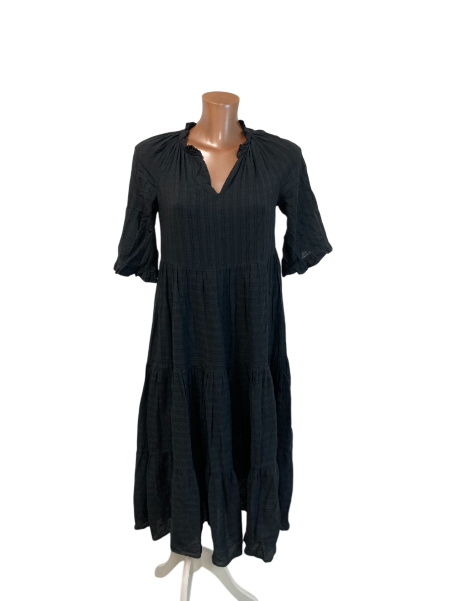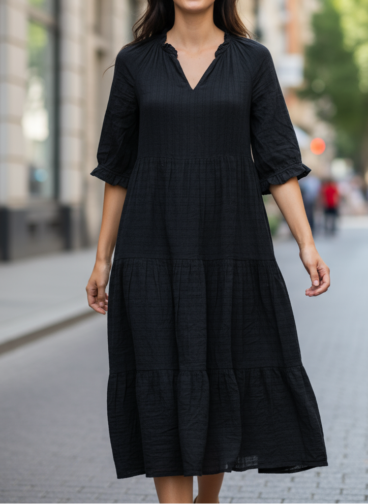 Krásné dámské šaty v tmavě zelené barvě s romantickým volánovým střihem a jemnými detaily.