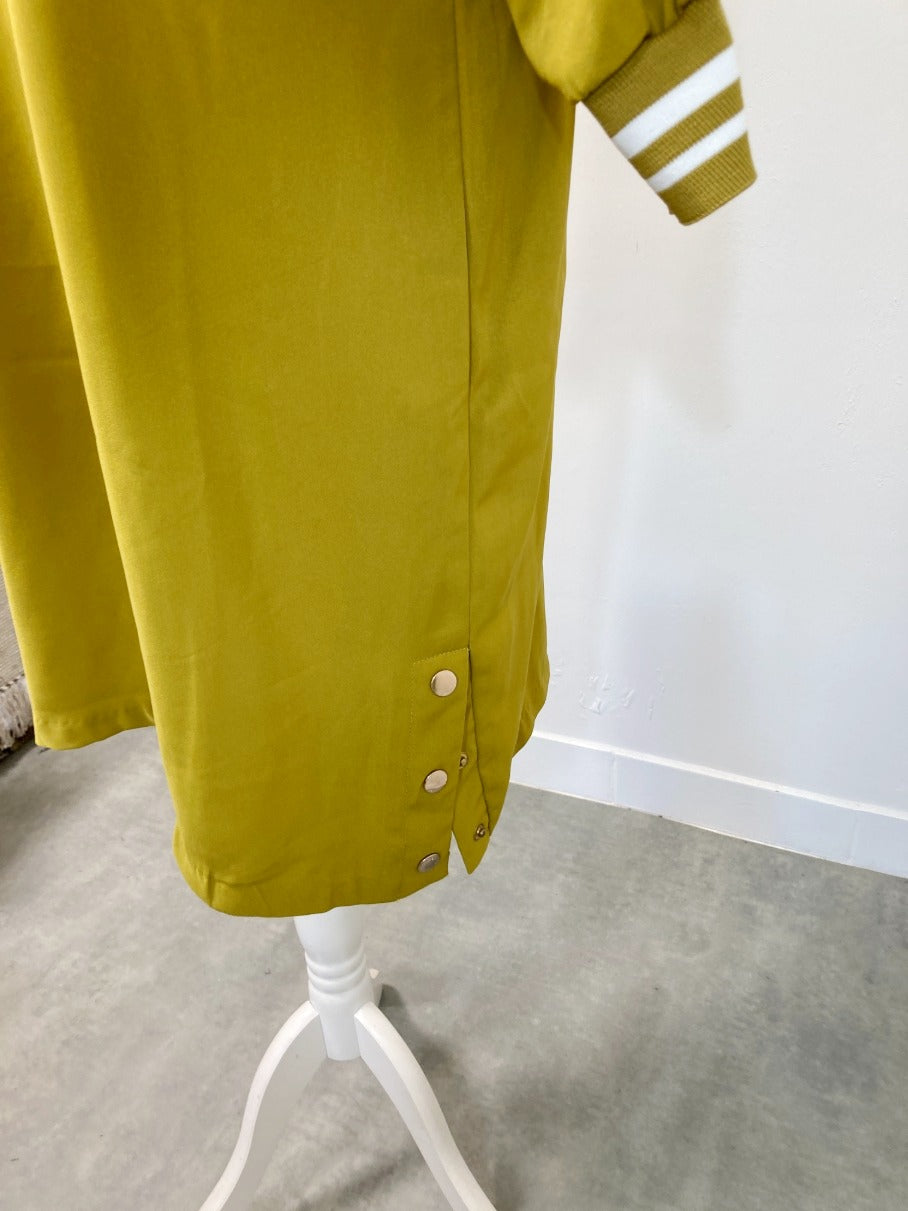 Stylové dámské šaty ve velikosti 38 ve výrazné hořčicové barvě s kontrastními detaily.