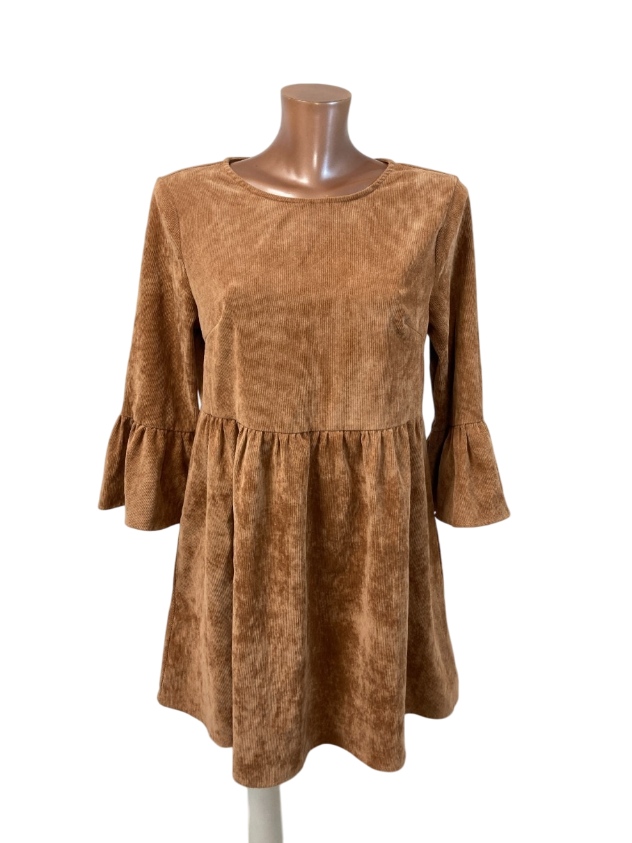 Stylové dámské šaty ve velikosti M v karamelové barvě s manšestrovým vzorem.