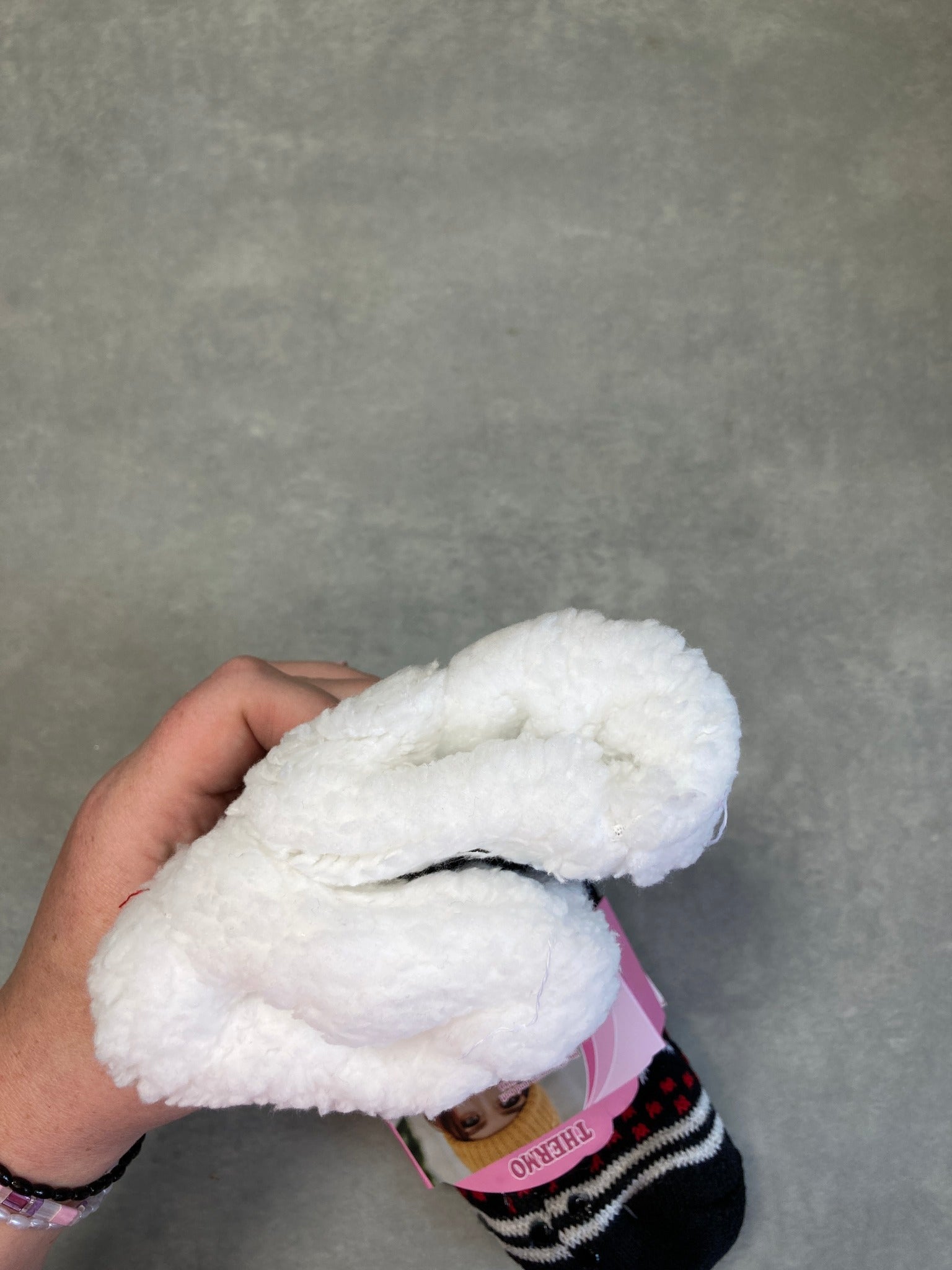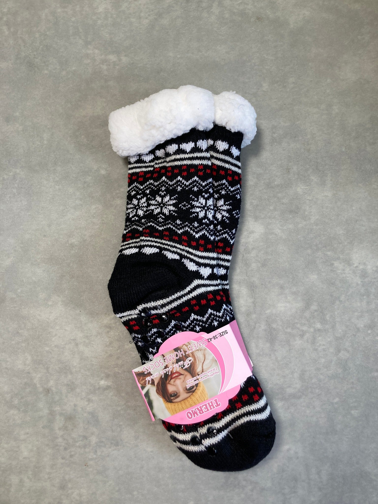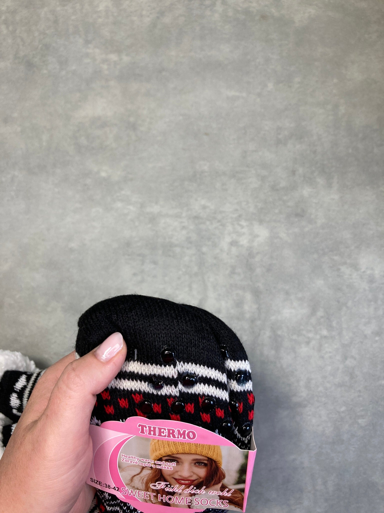 Stylové a teplé ponožky s tradičním norským vzorem v černobílé kombinaci s červenými detaily. Vnitřek ponožek je vybaven měkkým plyšovým podšívkou pro maximální teplo a pohodlí.