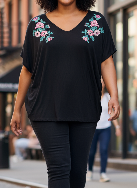 Krásné dámské tričko značky F&F v černé barvě s barevnou květinovou výšivkou.