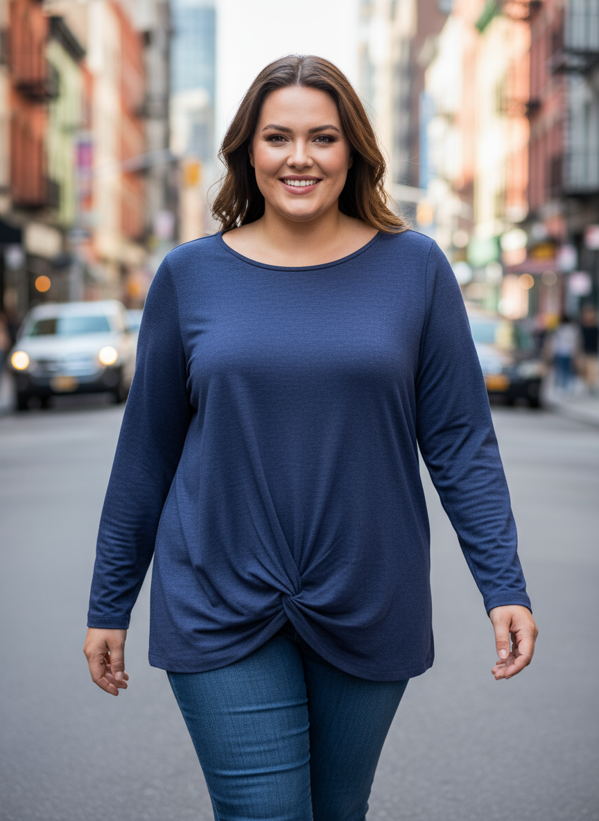 Stylové dámské tričko značky Janina ve velikosti 44 v tmavě modré barvě s originálním uzlem vpředu.