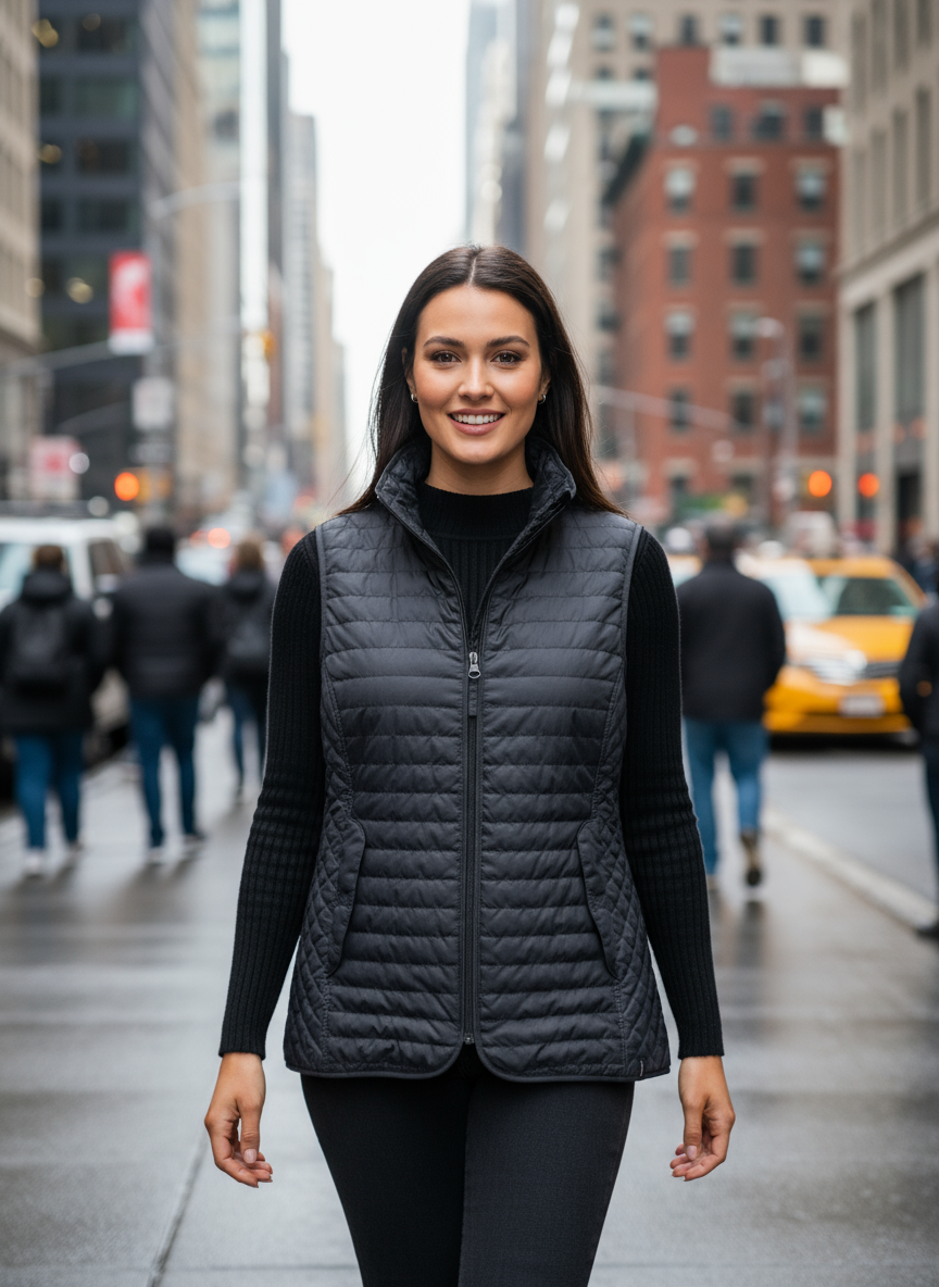 Teplá dámská prošívaná vesta značky Decathlon ve velikosti L v tmavě šedé barvě.